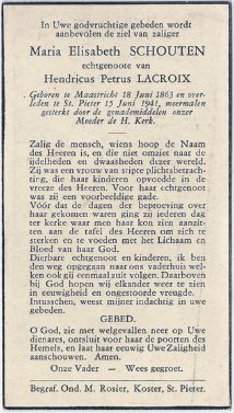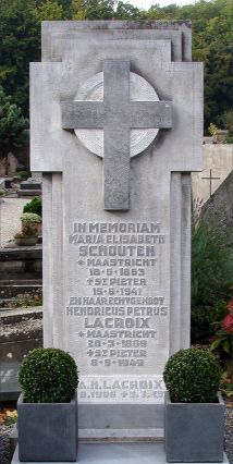 In memoriam / Maria Elisabeth / Schouten / * Maastricht / 18.6.1863 / † St Pieter 15.6.1941 / en haar echtgenoot / Hendricus Petrus / Lacroix / * Maastricht / 20.3.1869 / † St Pieter / 8.5.1949 J.A.H.Lacroix / * 3.8.1906 † 5.3.1979
