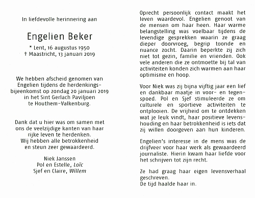 JANSSEN 23 september 1975. Engelien overleed 13 januari 2019, 68 jaar oud te