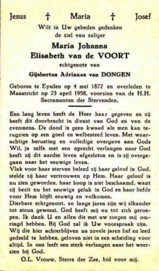 - Een kruis met aan zijkanten en voorkant: een kruisvorm - In memoriam / Elisabeth J.M.van de Voort / * 4-5-1872 / † 23-4-1958 / echtg. van / Gus van Dongen / * 9-9-1875 / † 18-9-1961 Wiel van de voort ∞ annie Litjens