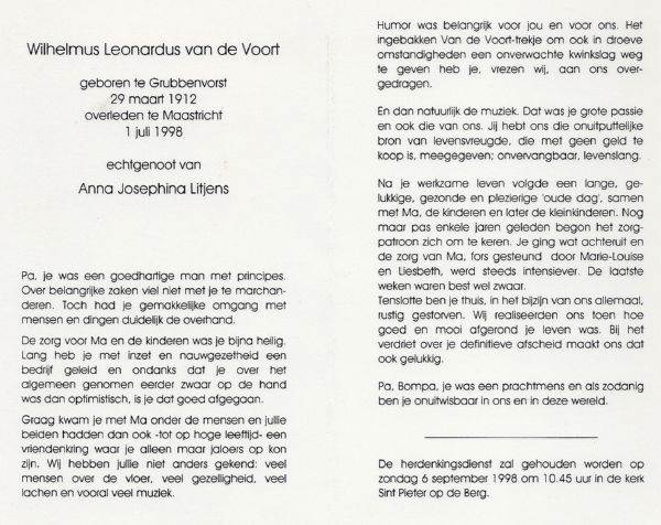 Wilhelmus Leonardus VAN DE VOORT werd geboren op 29 maart 1912 te Grubbenvorst als zoon van Peter Lambertus VAN DE VOORT en Maria Hubertina HUBERTS. Wiel huwde Anna Josephina LITJENS, dochter van Hendrik Jozef Hubertus LITJENS en Louisa WILMS. Wiel overleed 1 juli 1998, 86 jaar oud te Maastricht en werd gecremeerd. 22 oktober 1998 werd de asbus bijgezet te St. Pieter (voorheen vak Z 86). Zijn echtgenote Anna Josephina LITJENS werd geboren op 26 juni 1916 te Beesel. Annie overleed 5 augustus 2011, 95 jaar oud te Maastricht. Annie werd gecremeerd op 11 augustus 2011 te Eijsden; de asbus werd bijgezet te St. Pieter.