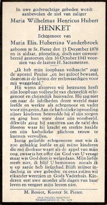 vii. Marie Emmanuel Petrus Hubertus HENKET geboren op 25 december 1876. Emmanuel is overleed 27 maart 1957, 80 jaar oud te Maastricht(St. Pieter) en werd 30 maart 1957 te St. Pieter bijgezet in het familiegraf. Emmanuel bleef ongehuwd en was gemeenteopzichter opzichter (1ste klas) van de gemeentelijke gasfabriek (Gemeentebedrijven). Sterfhuis Burg. Ceulenstraat 42. viii. Maria Wilhelmus Hendricus Hubertus HENKET geboren op 13 december 1878 te St. Pieter. Henri huwde Maria Elisabeth Hubertina VANDERBROECK, dochter van Henricus Hubertus VANDERBROECK en Maria Elisabeth HENDRIKX, 27 februari 1905 te St. Pieter. Henri overleed 16 oktober 1941, 62 jaar oud te Maastricht (St. Pieter); sterfhuis "Wijngaard" Lage Kanaaldijk 87 en werd 20 oktober 1941 bijgezet in het familiegraf te St. Pieter. Elisa werd geboren op 29 september 1879 te St. Pieter. Zij overleed 19 april 1964, 84 jaar en 6 maanden oud te Maastricht (St. Pieter) en werd 22 april 1964 bijgezet in het familiegraf te St. Pieter. Henri was landbouwer en groenteteler. Hij woonde op de Lage Kanaaldijk 87 en 18 te St. Pieter.