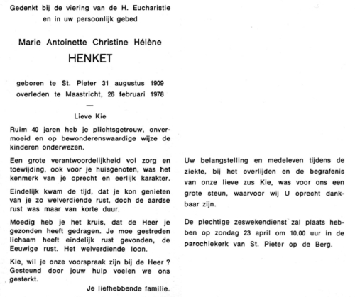 Giel staat in de rechterboog derde van rechts. Organist Rick DEBIE had voor deze gelegenheid de feestmis, Missa Festiva in honorem Sancti Petri et Pauli, gecomponeerd. Thea SATIJN-NIESTEN zong de sopraansolo en de Avanti-kapel zorgde voor de orkestrale omlijsting. Het geheel stond onder leiding van Ingrid DEBIE-VAN DER AART, dirigente van het koor. Zie ook: Het Gemengd Kerkelijk Zangkoor St. Caecilia St. Pieter op de Berg te Maastricht. Historie. iii. Marie Antoinette Christine Hélène HENKET geboren op 31 augustus 1909. Kie overleed 26 februari 1978, 68 jaar oud te Maastricht (Wijngaard) en werd 2 maart 1978 te St. Pieter bijgezet in het familiegraf.