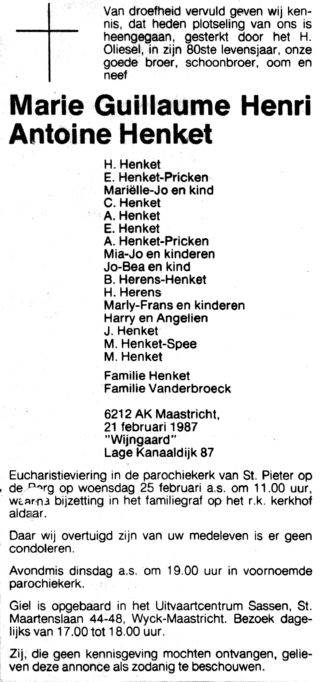 ii. Marie Guillaume Henri Antoine HENKET geboren op 2 december 1907. Giel overleed 21 februari 1987, 79 jaar oud te Maastricht (Wijngaard) en werd bijgezet in het familiegraf te St. Pieter op 25 februari 1987. Giel was broodbakker van beroep en drager van de Gouden Medaille in de Orde van St. Gregorius. Zijn bijnaam was "Bill".