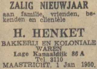 v. Marie Henri Antoine Emmanuel HENKET geboren op 14 november 1911. Harrie overleed 31 oktober 1997, 85 jaar oud te Maastricht. Harrie werd 5 november 1997 gecremeerd te Geleen. Hij was brood- en banketbakker, winkelier in koloniale waren op de Lage Kanaaldijk 86a te St. Pieter.
